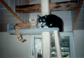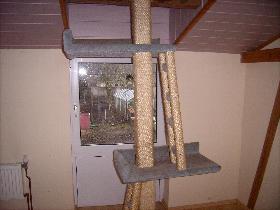Im oberen Geschoß unserer ehemaligen Mühle befinden sich die Katzenräume. Hier kann man allein oder in kleinen Gruppen der Chefin ganz oben vom Kratzbaum aus bei Ihrer Hofarbeit zuschauen oder einfach nur abhängen. Mehrmals am Tag kann man sich was leckeres zum Fressen abholen oder einfach nur mal eine Streicheleinheit genießen. Aber das "Kratzbaum hochrennen" bis in die Dachspitze gefällt uns allen am besten.